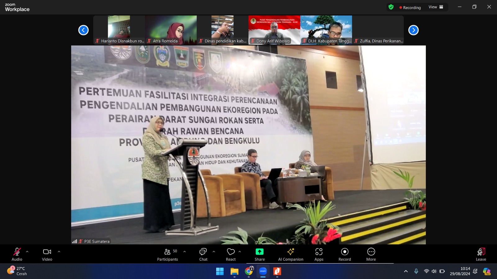 Hadir dalam Pertemuan Fasilitasi Integrasi Perencanaan Pengendalian Pembangunan Ekoregion Sumatera pada hari Kamis tanggal 29 Agustus 2024 secara daring/online oleh Bidang Koordinasi Perencanaan Pengendalian Pembangunan Ekoregion.